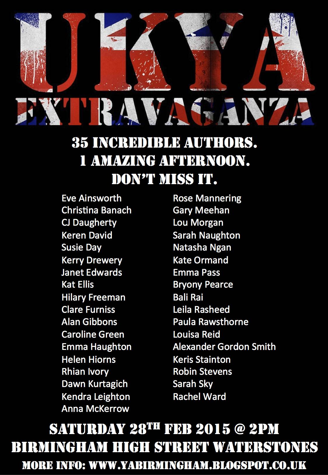 - On the 28th of Feb I’ll be attending the UKYA Extravaganza at Waterstones in Birmingham, where authors and bloggers will be doing talks/reading/generally gushing about young adult fiction. Here’s the list of authors who’ll be there: